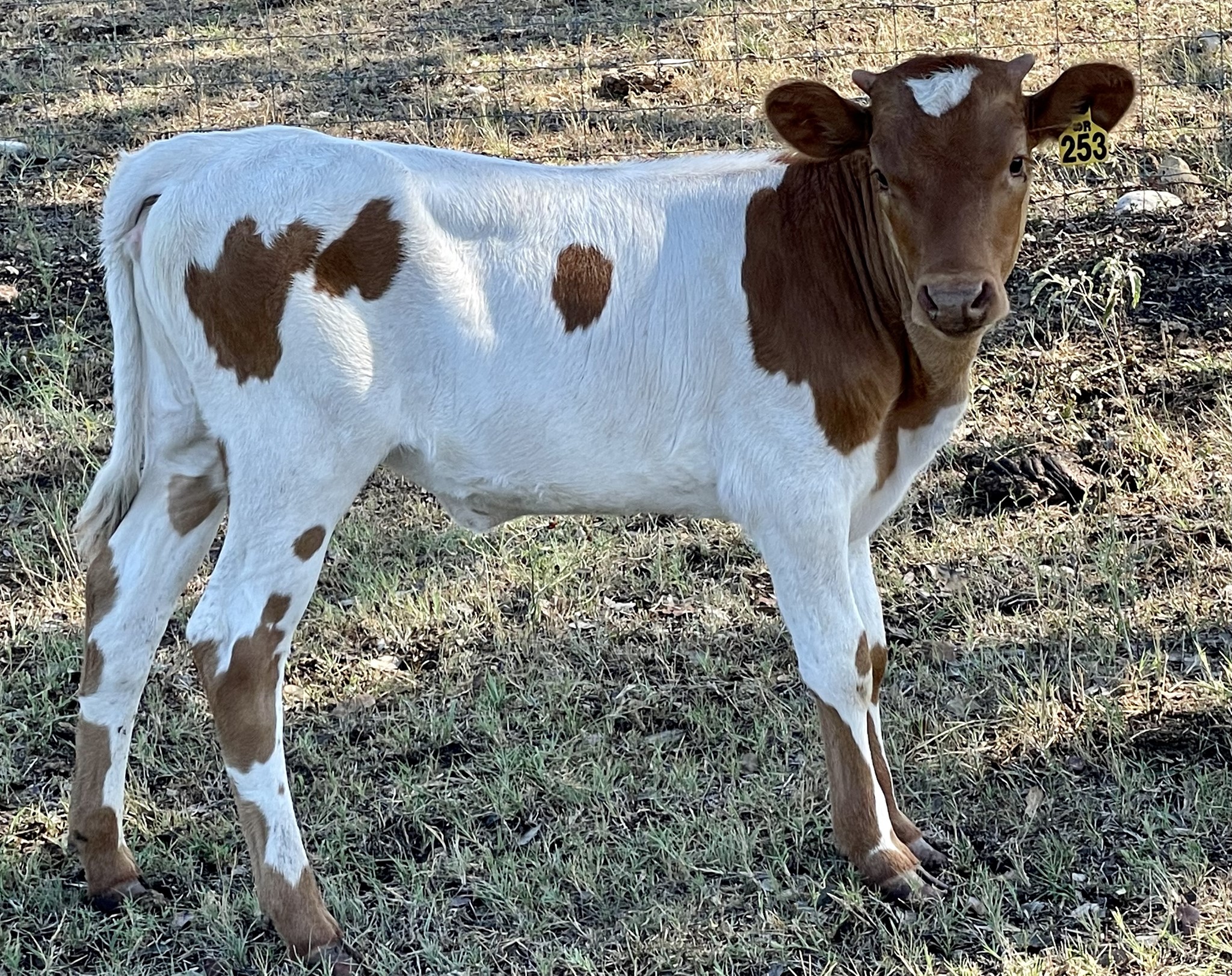 Red head with white star, red neck, and white body with red spots and red patches on legs.