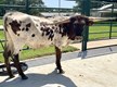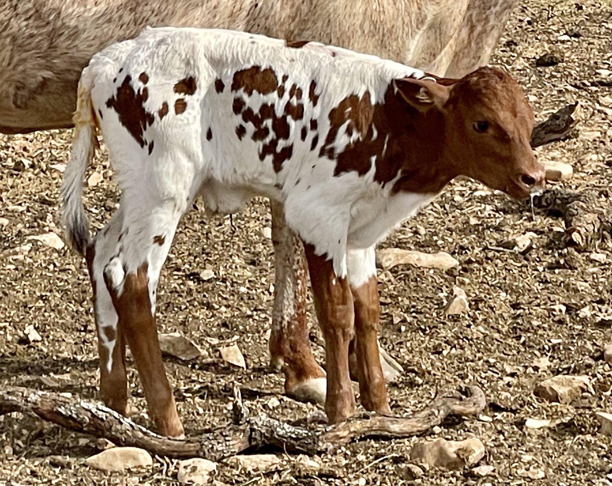 Red head and neck, red legs, white body with red spots, white tail with dark switch.