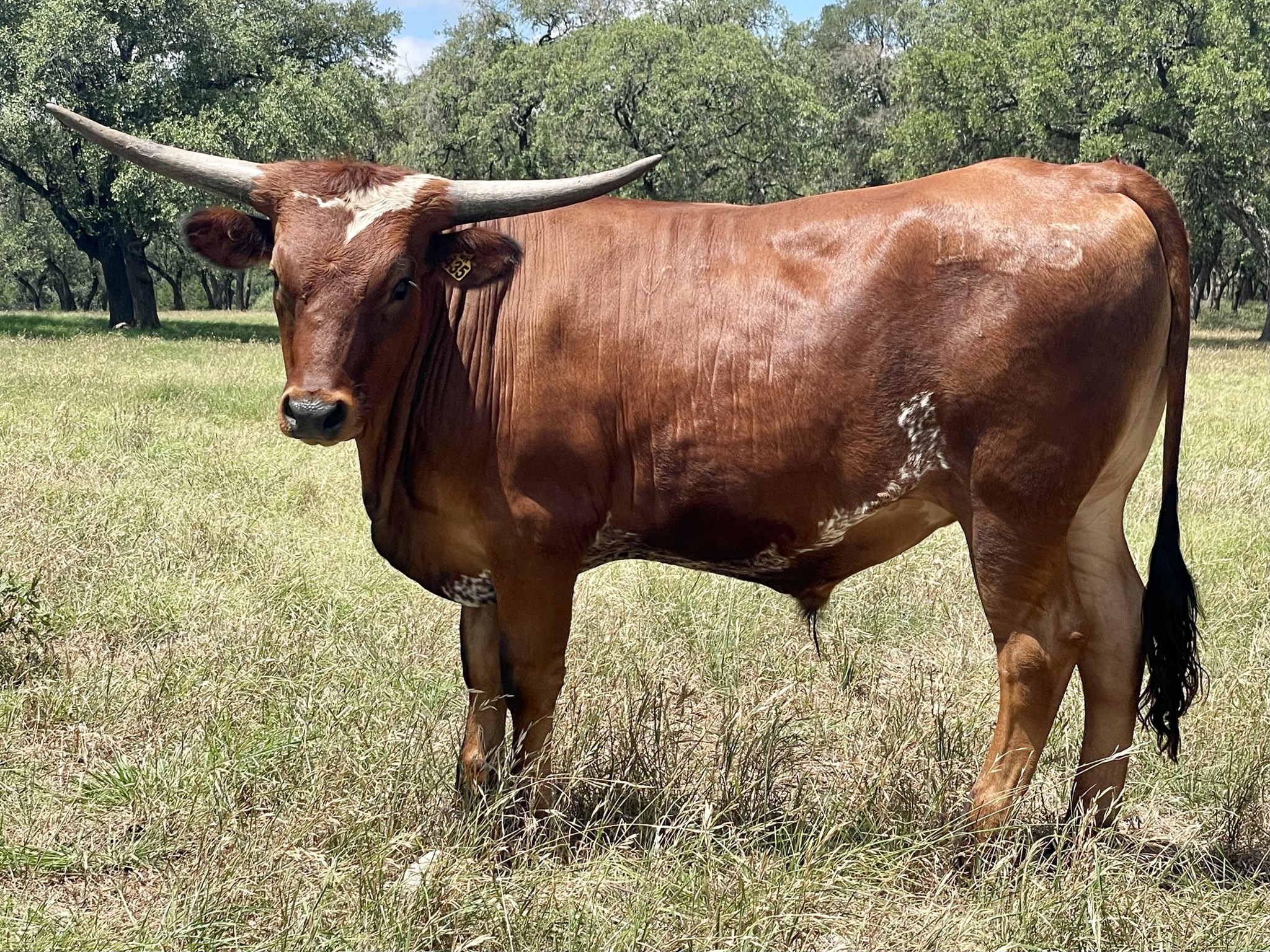Parker brown with white on forehead, black nose, white on thighs, black switch
