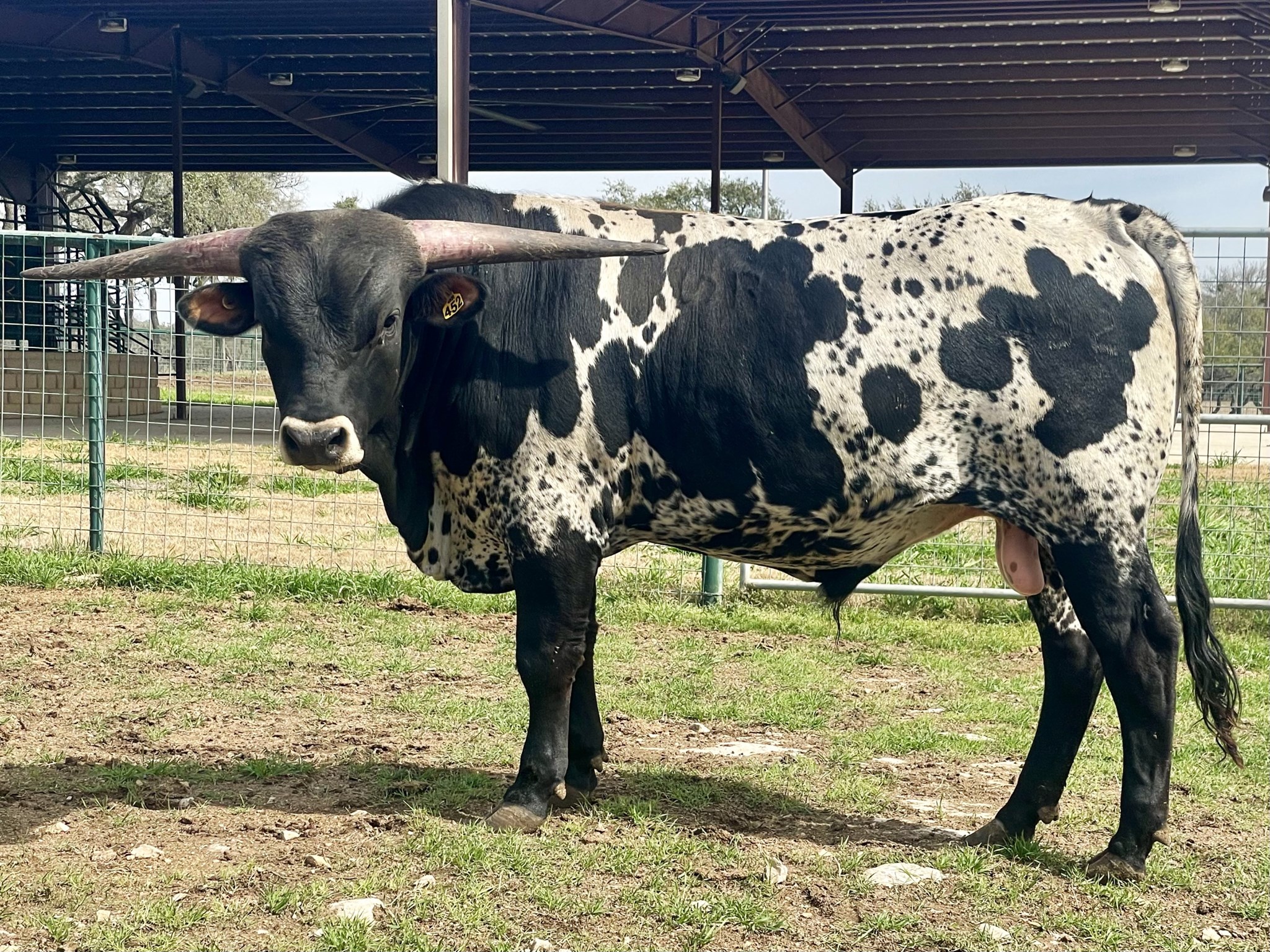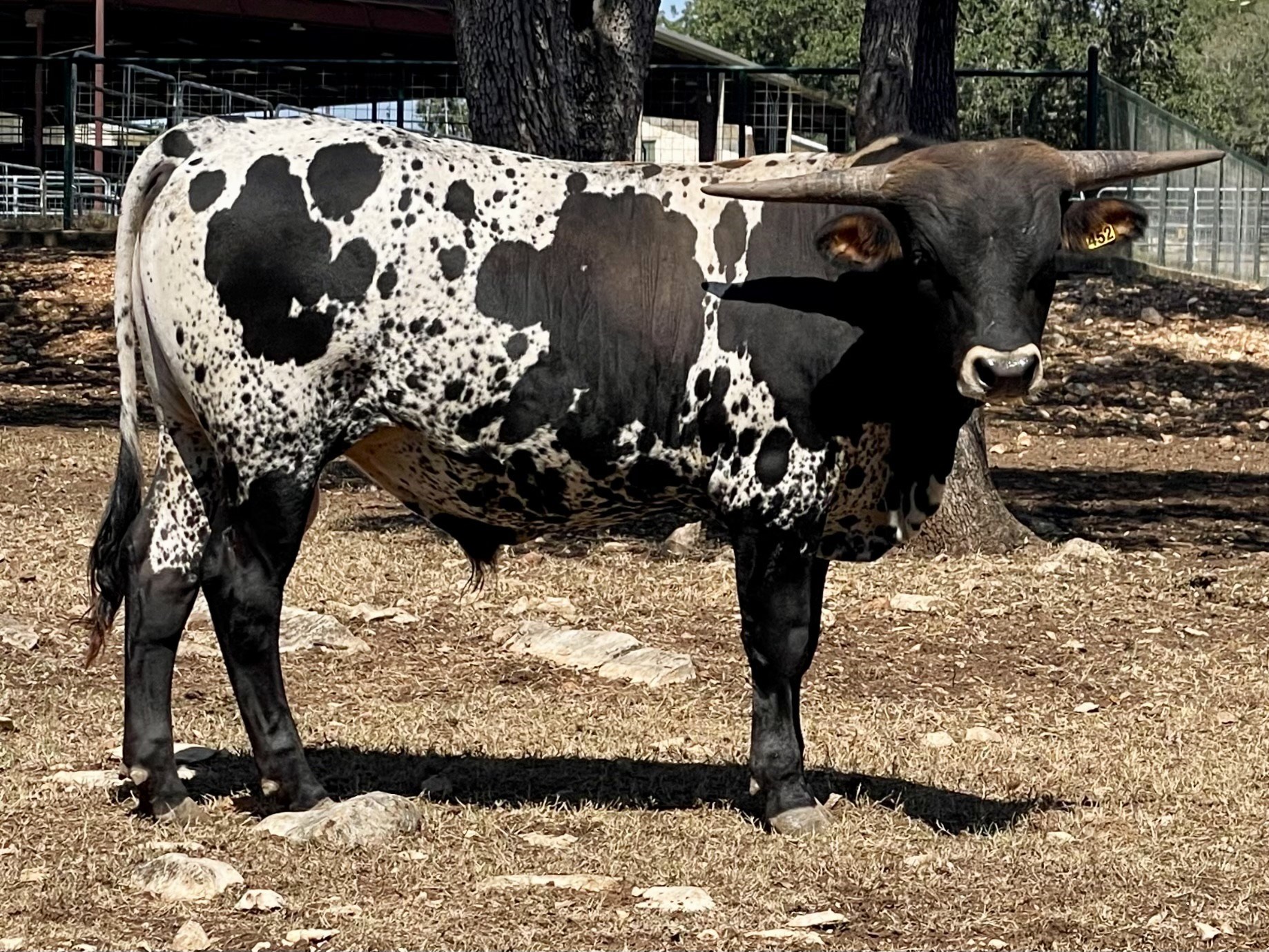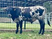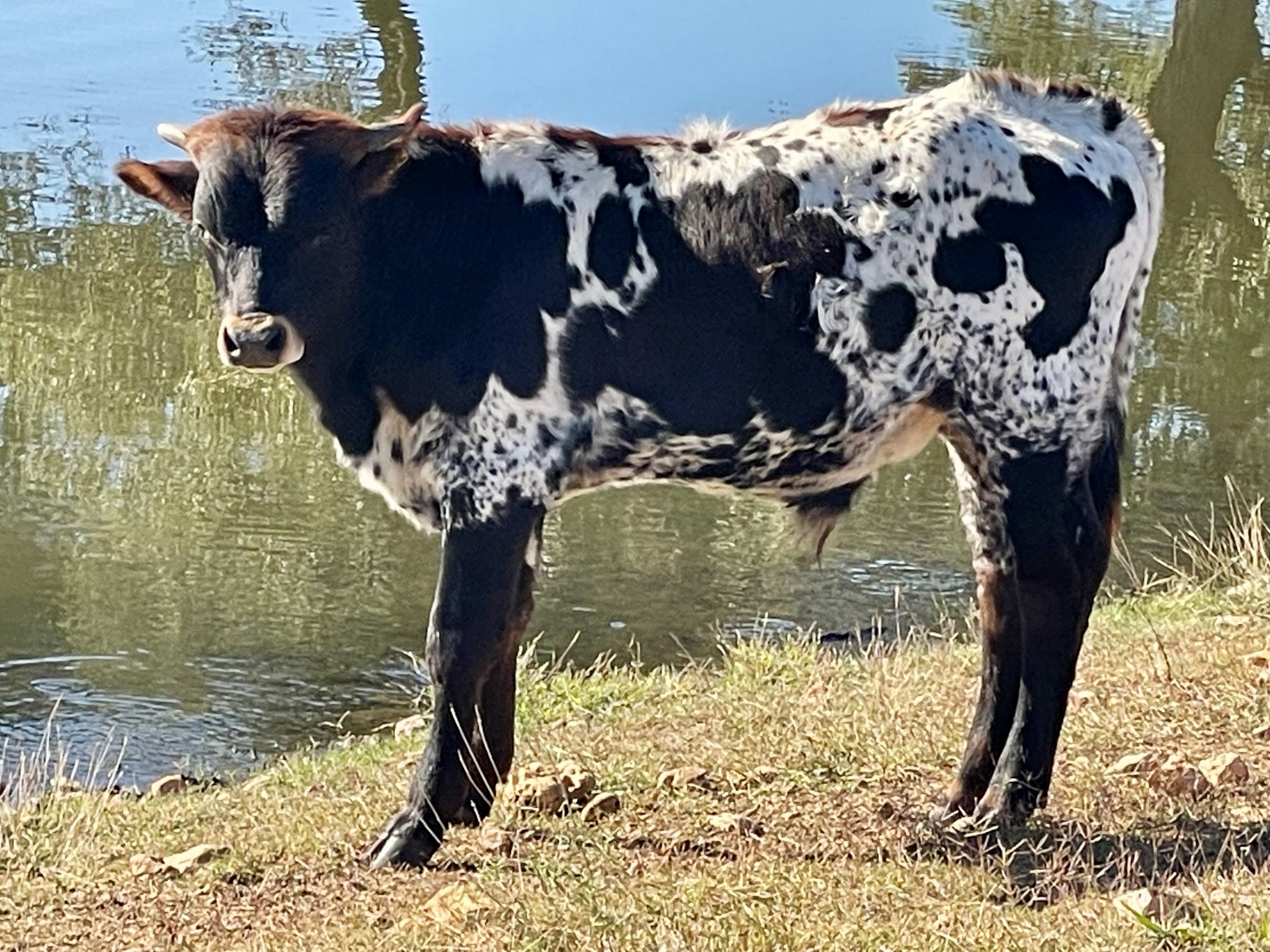 Walnut head, neck, shoulders, and legs. Black nose and toes. White body with walnut speckles and large walnut patches. Black tail tip.