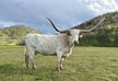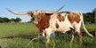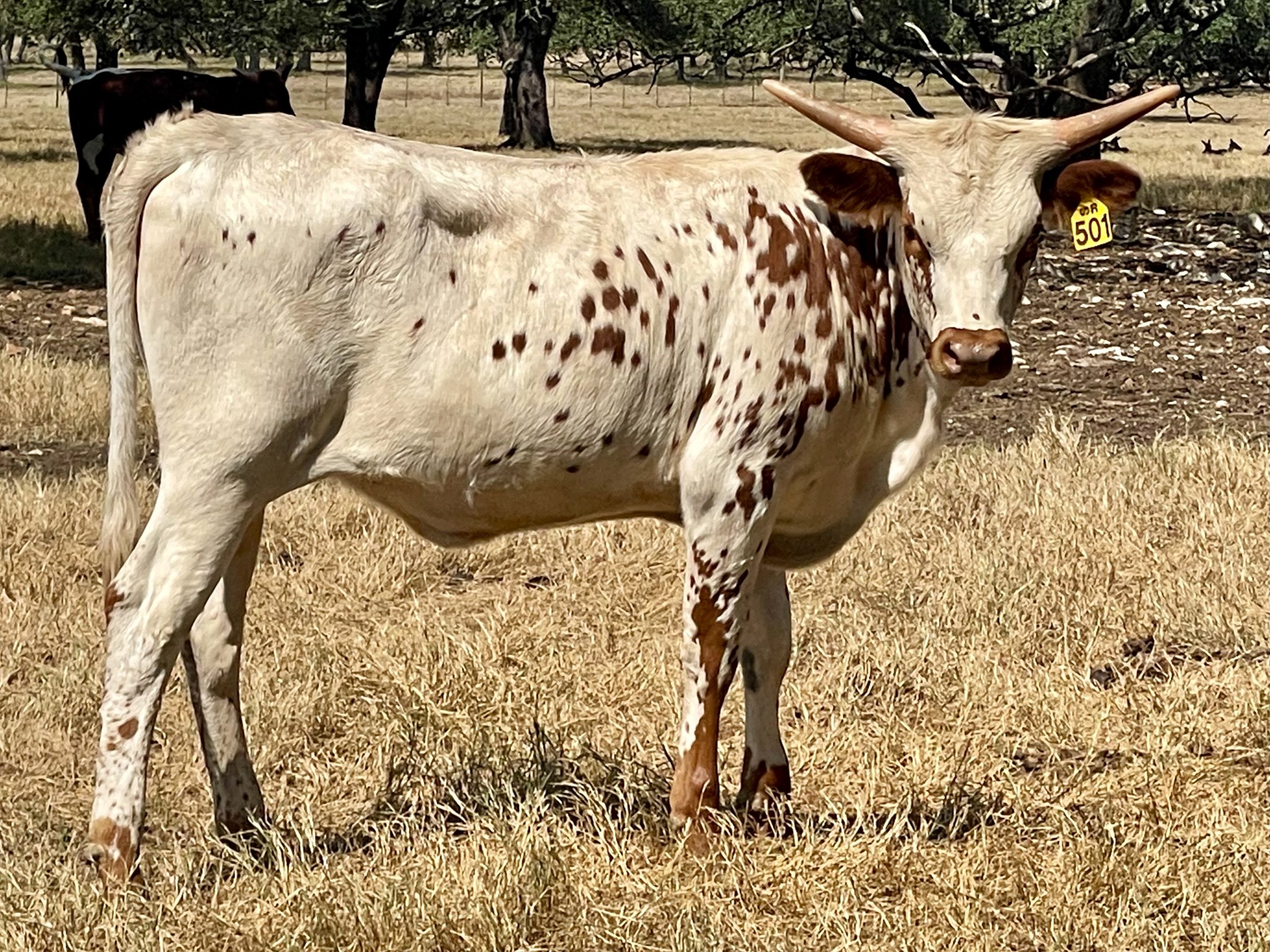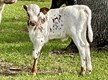 White head with brindle ears, mouth, and brindle freckles. White body with brindle spots and red ankles.