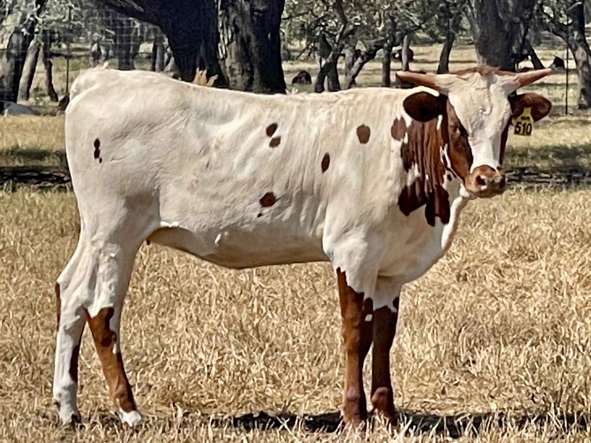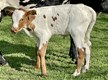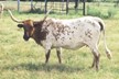 Brindle head with white shield, brindle neck and legs, and white body with a few brindle spots