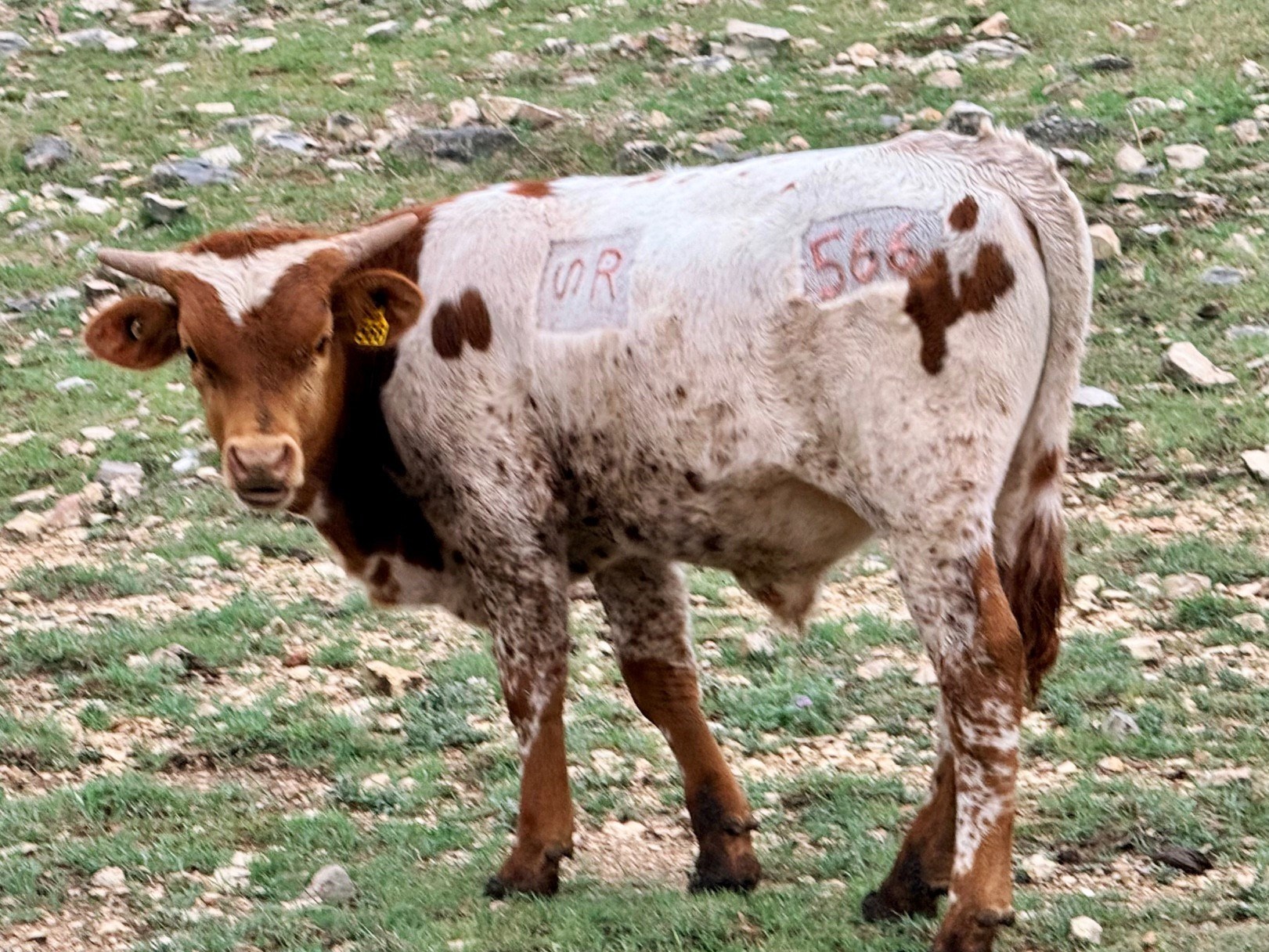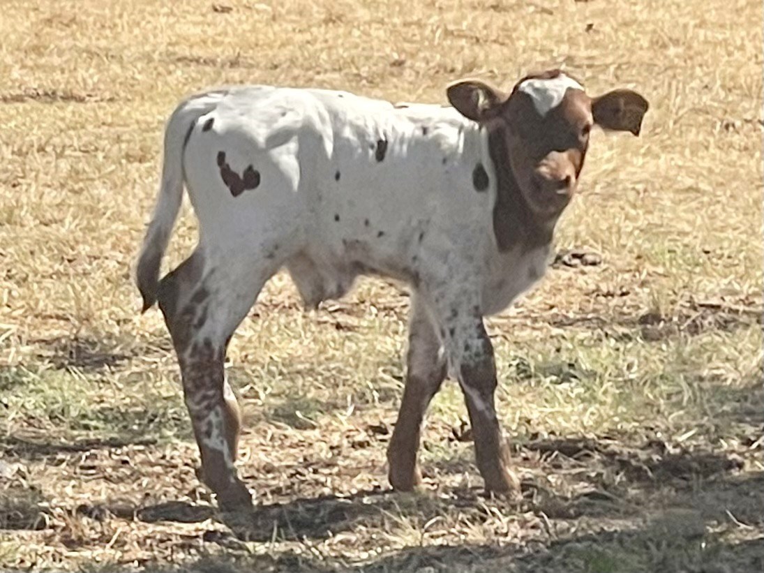 Red head with white shield, red neck, and red and white speckled legs. White body with red spots