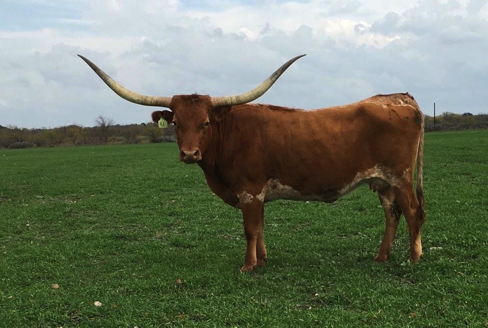 Texana is a big bodied and big horned cow. She is always high headed and her color and size makes her one of our favorite longhorns