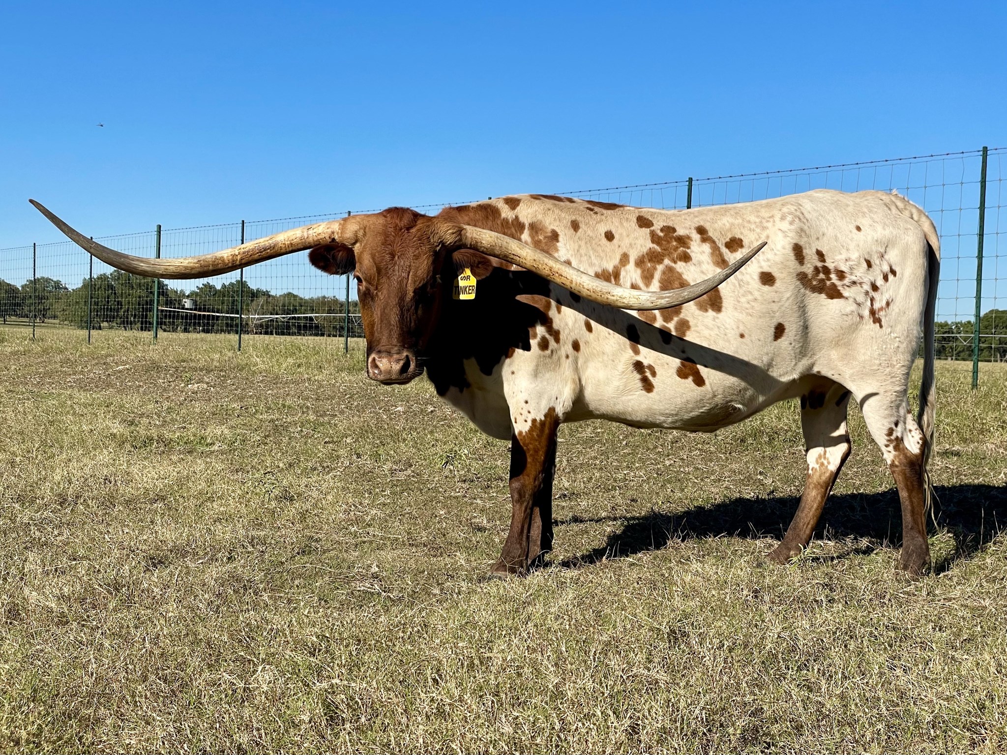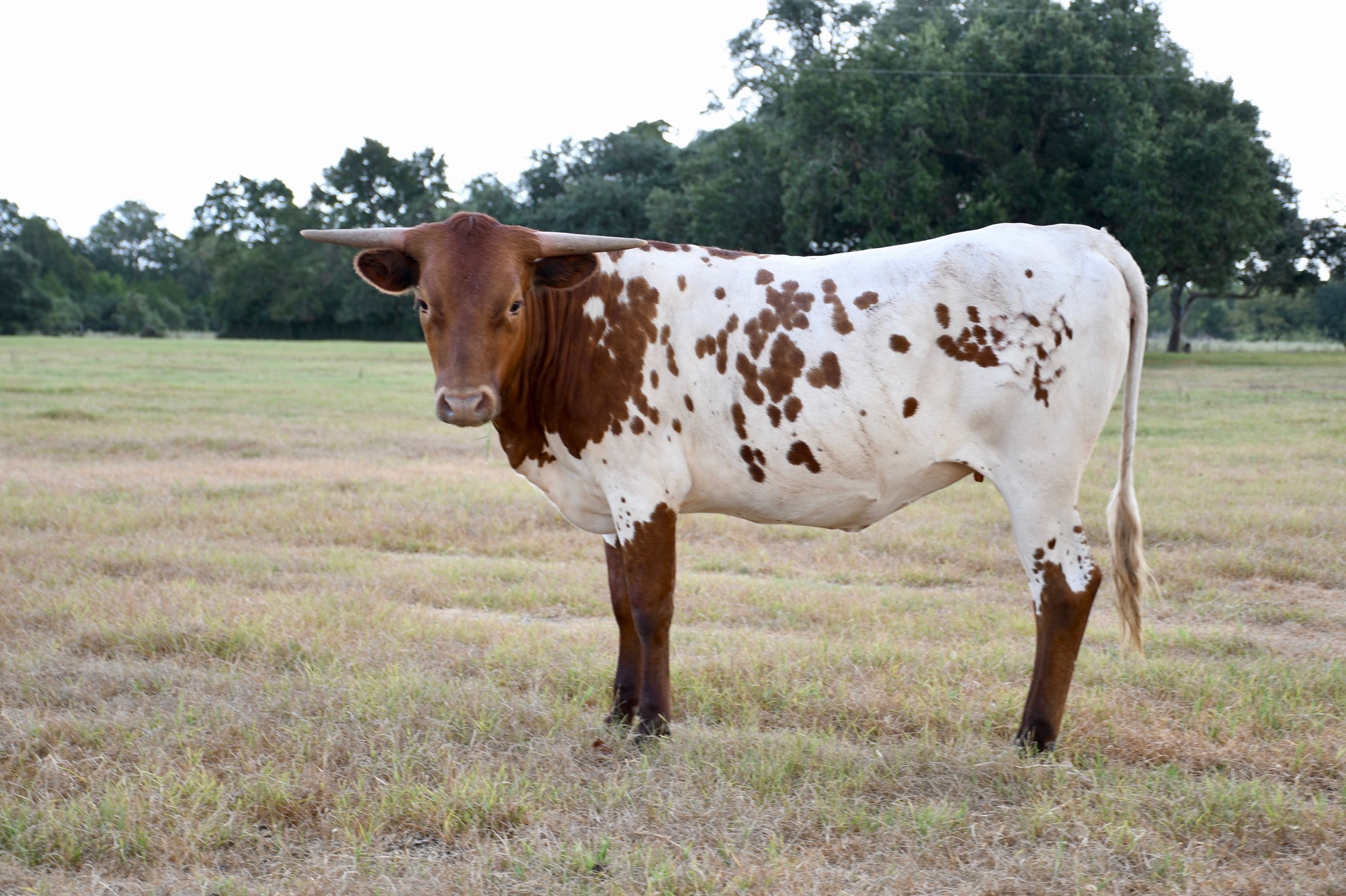 Red and white. Extremely balanced, big bodied, lateral horn, correctly put together, Swagger daughter.